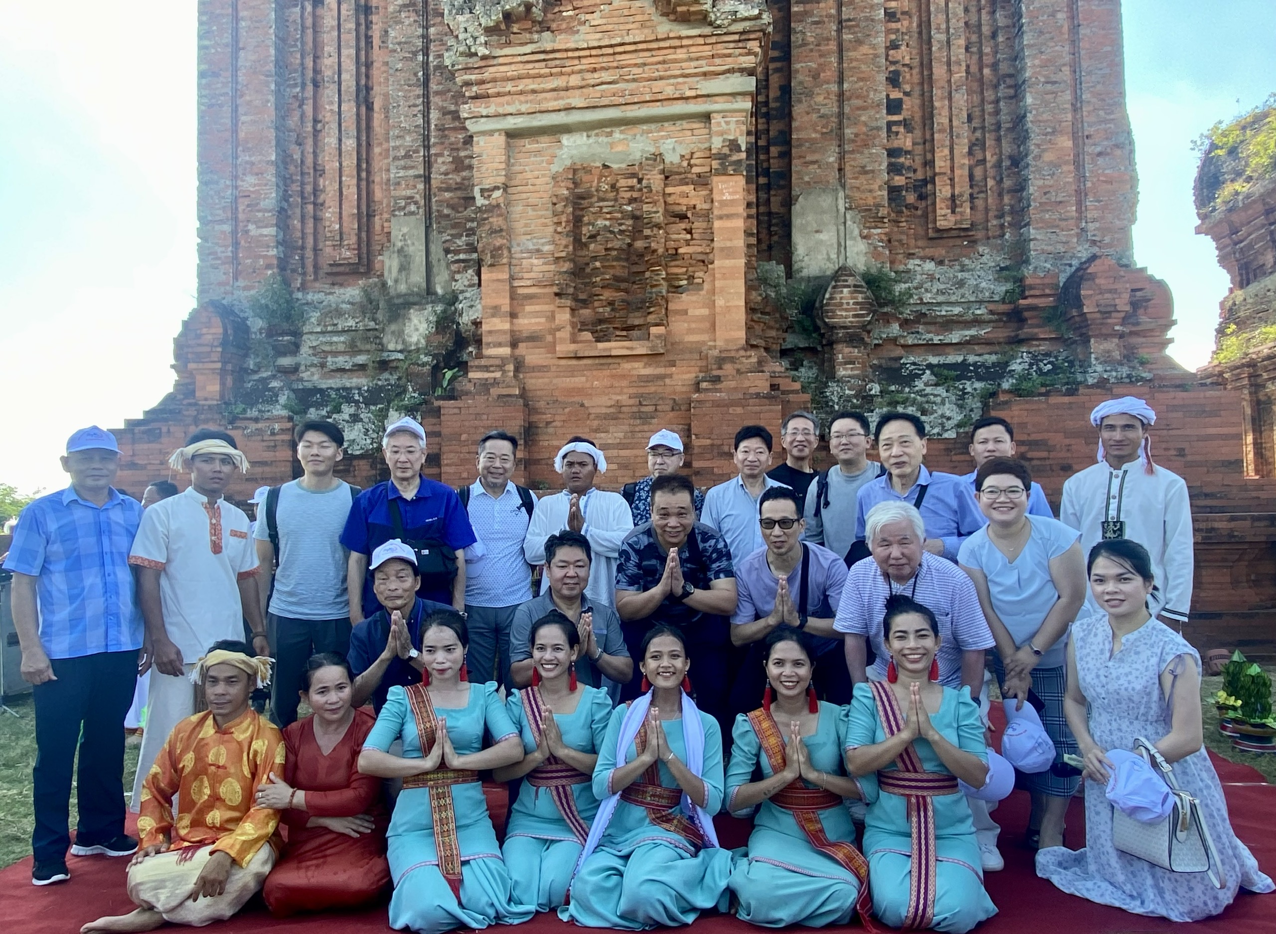 Đoàn du khách Nhật Bản hào hứng chụp ảnh lưu niệm cùng đoàn nghệ nhân Chăm tỉnh Ninh Thuận
